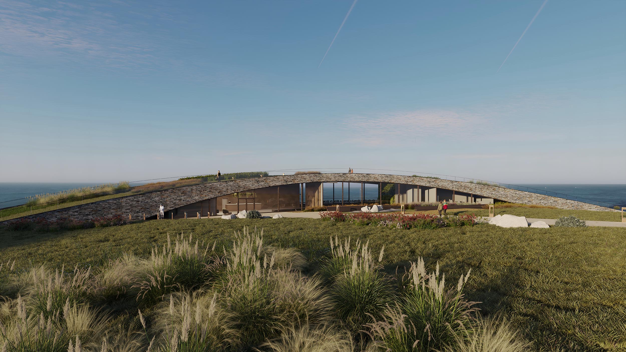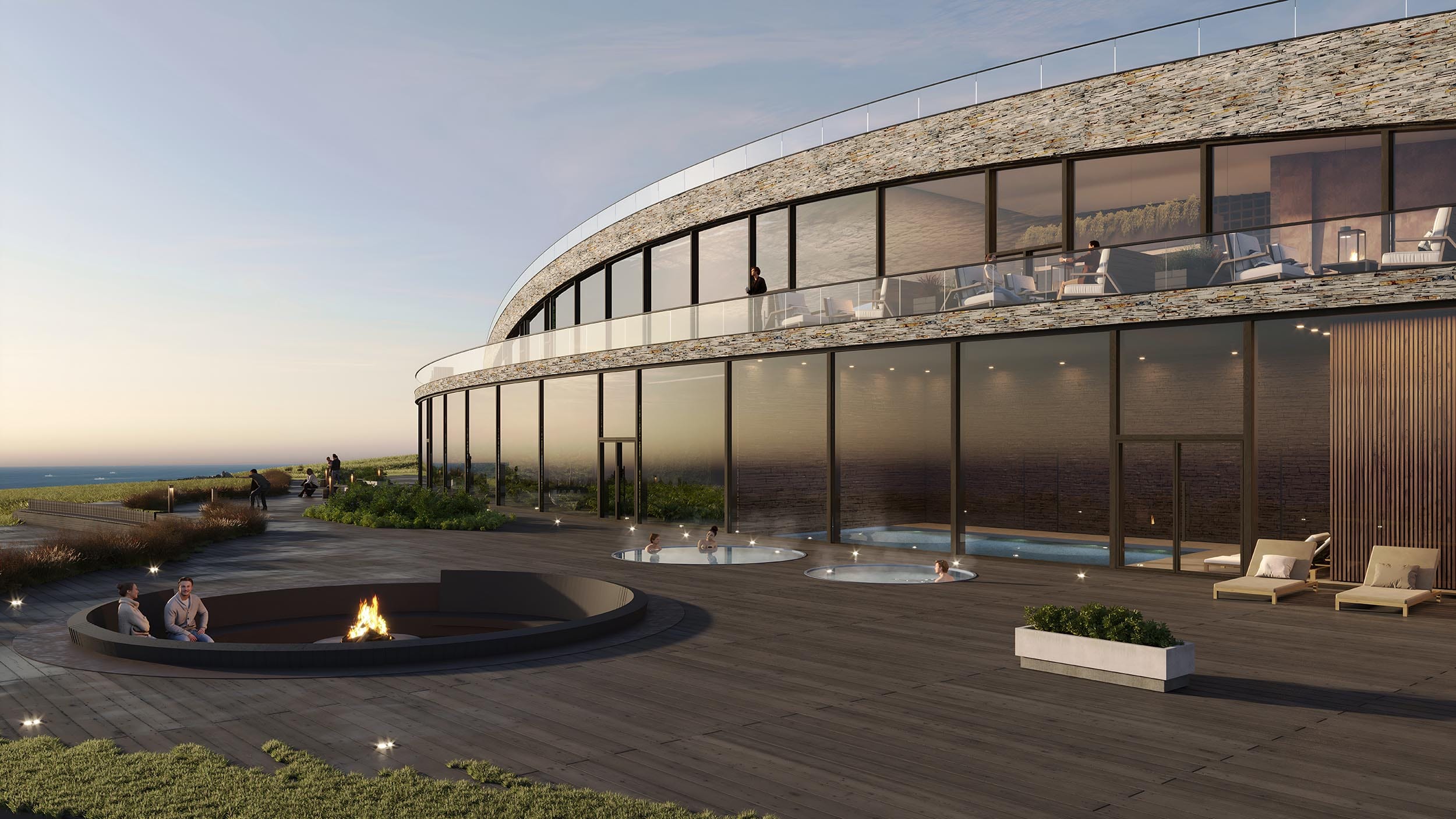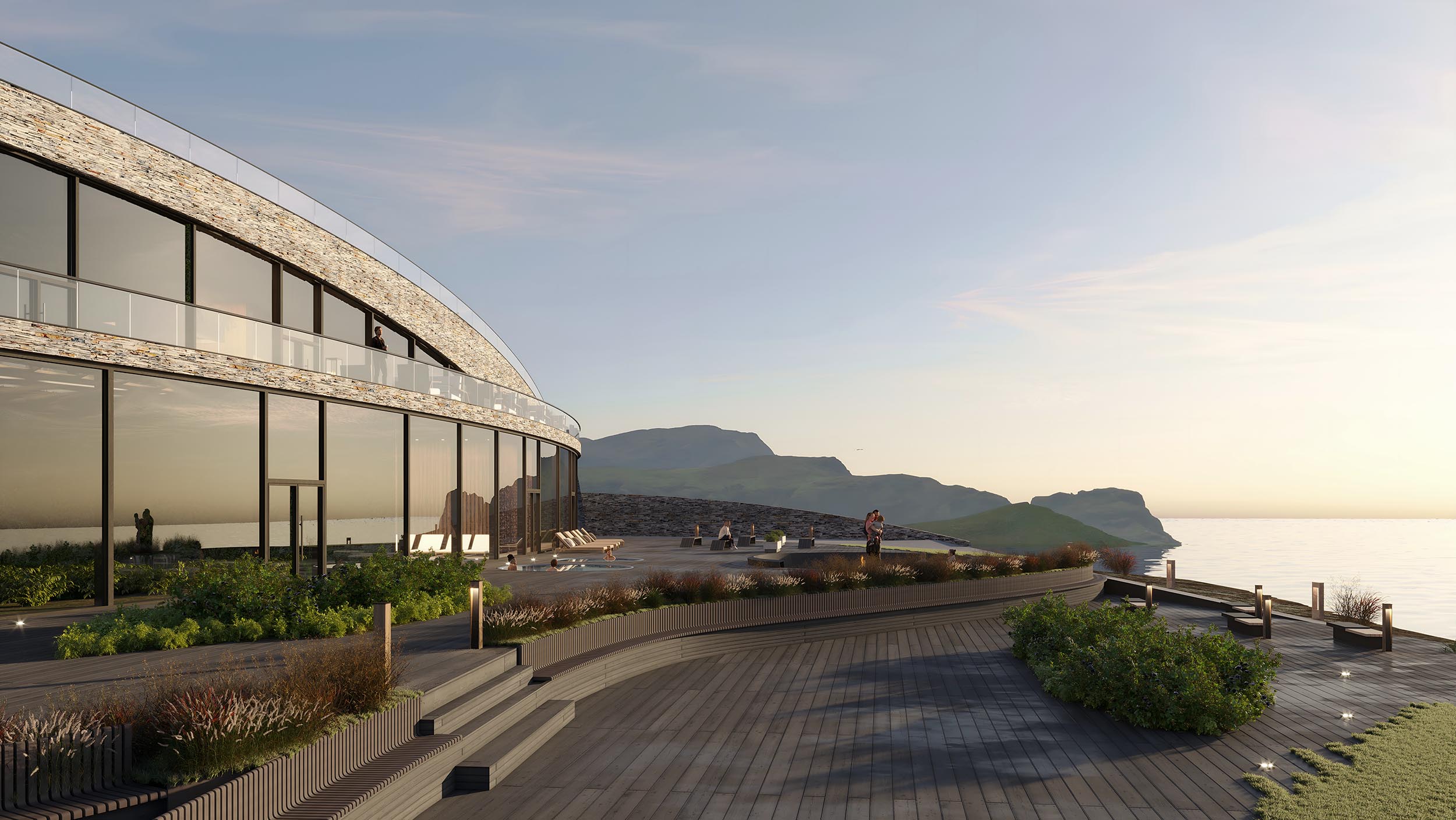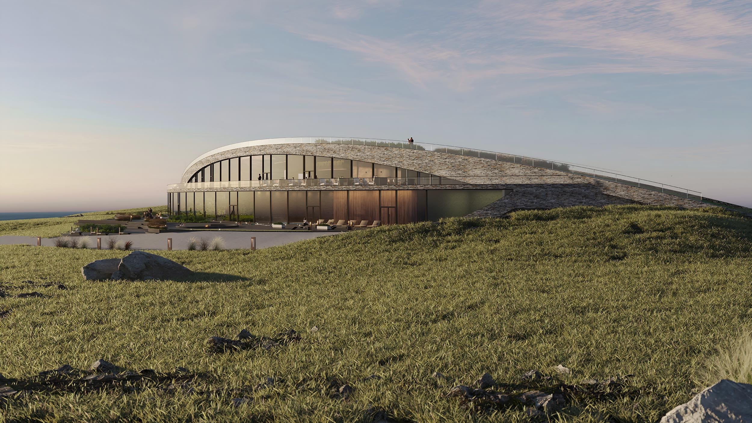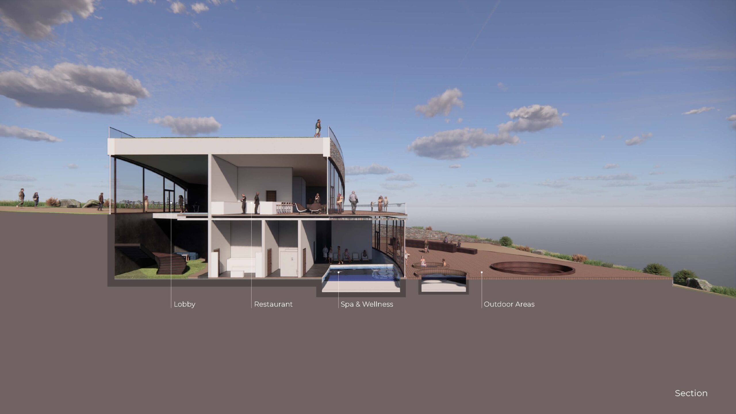 The hotel is located in Norway’s western-most cliff with an astonishing view to the surrounding islands and the ocean. Vestkapp is well known for its stormy weather, which has been causing a great harm to the building located in close proximity. Considering this unique location the building was designed to maximize the view and avoid strong winds.