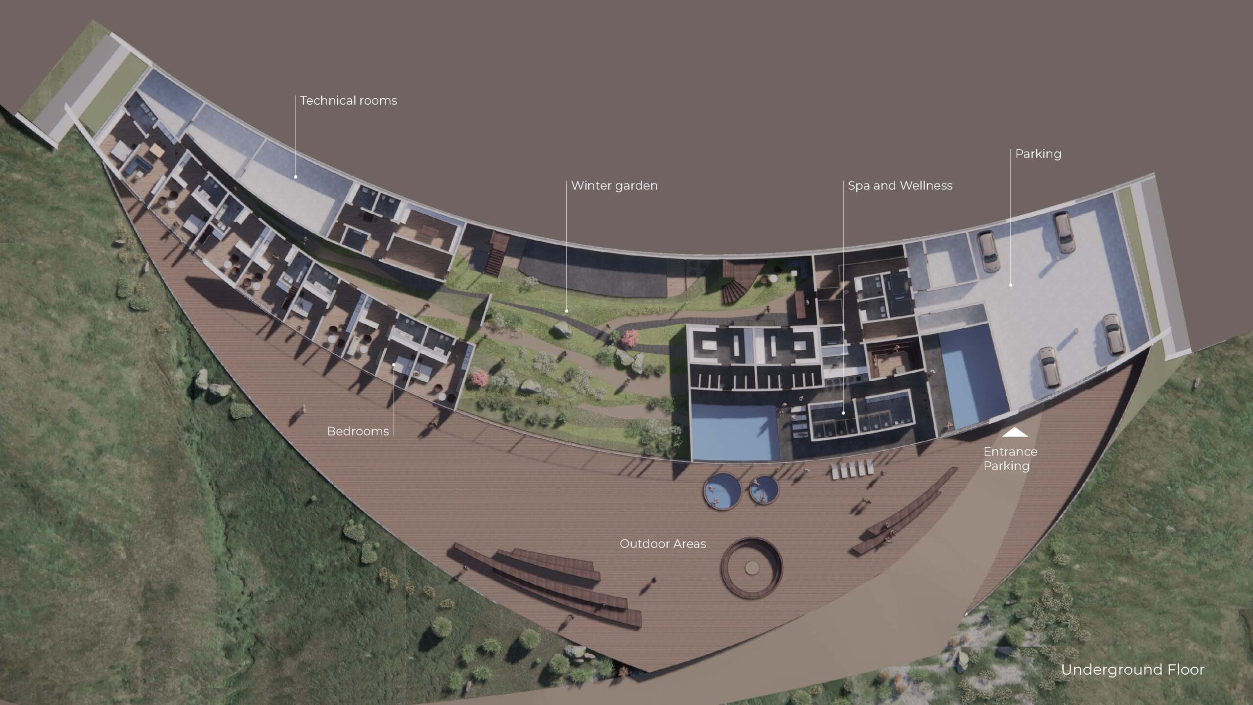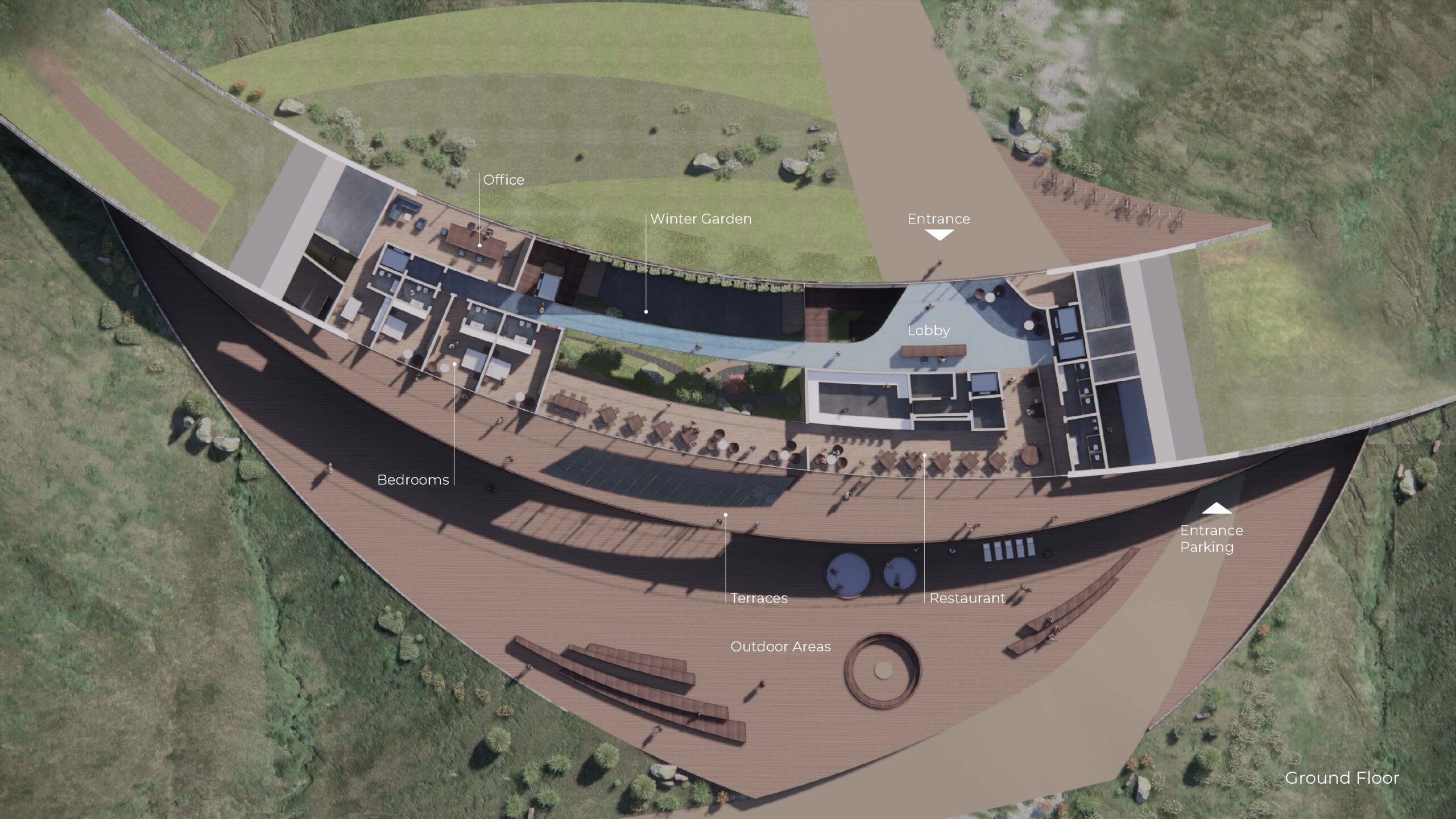 The centrepiece of the project both directly and indirectly is the winter garden that becomes the connecting point of the hotel rooms on one side and the restaurant with the spa on the other. Some of the herbs and plants grown here are served in the restaurant, while the waste is partly composted in the garden. The rainwater, the grey water from the restaurant, the spa and the hotel rooms are filtered and used for irrigation.